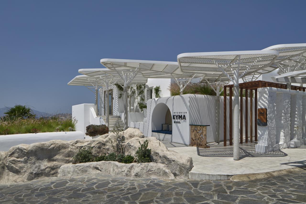 Das Myconian Kyma ist ein Boutique-Hotel im Zentrum von Mykonos-Stadt (Chora). Durch die Lage im Herzen der Inselstadt können Gästen die engen Gassen, traditionellen Kirchen, Boutiquen, Bars und Restaurants, die Mykonos so charakteristisch machen, in wenigen Minuten fußläufig erreichen. Das Hotel kombiniert moderne Elemente mit kykladischer Architektur: helle Fassaden, natürliche Materialien und offene Raumkonzepte sorgen für eine ruhige, einladende Atmosphäre. Die Zimmer und Suiten sind sorgfältig gestaltet und bieten eine zeitgemäße Ausstattung. Zahlreiche Unterkünfte verfügen über private Balkone oder Terrassen mit Blick auf die Stadt, die verwinkelten Dächer der Altstadt oder das Ägäische Meer. Einer der größten Pluspunkte des Myconian Kyma ist aber ganz ohne Zweifel die unmittelbare Stadtnähe zu Mykonos-Satdt. Ohne lange Transfers sind Sehenswürdigkeiten wie der Hafen „Skalaria“, die Windmühlen von Mykonos oder der alte venezianische Hafen erreichbar.