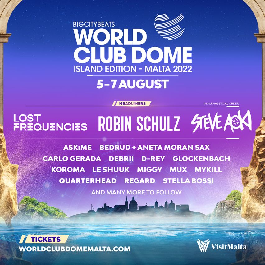 Mit dem BigCityBeats WORLD CLUB DOME kommt das Club-Event des Jahres 2022 nach Malta: Vom 5. bis zum 7. August 2022 können Fans elektronischer Musik auf verschiedenen Pool- und Bootspartys sowie abendlichen Raves in Maltas besten Open-Air-Locations abtanzen. Vor der sonnigen Kulisse der maltesischen Landschaft erwartet die Partygäste ein unvergessliches Clubbing-Wochenende im Herzen des Mittelmeers. Mit den Headlinern Steve Aoki, Lost Frequencies und Robin Schulz geben internationale Star-DJs den Beat vor.