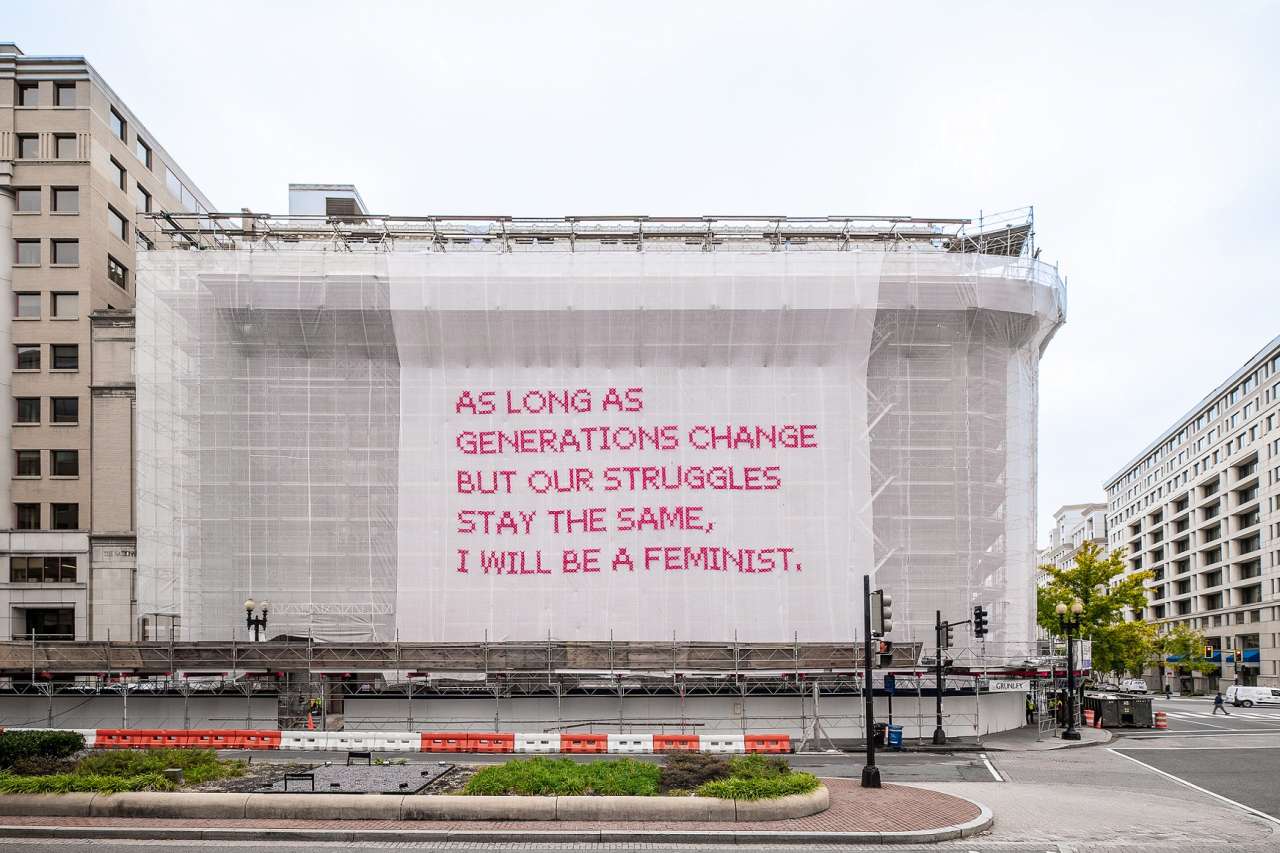Wie eine Baustelle zum Sprachrohr für Kunst werden kann, zeigt das National Museum of Women in the Arts (NMWA) in Washington, DC. Derzeit wegen Renovierungsarbeiten geschlossen, macht es jetzt mit einer spektakulären Kunstinstallation an seiner nördlichen Außenfassade von sich reden. Die österreichische Künstlerin Katharina Cibulka sorgt mit einer Botschaft auf 25 x 25 Metern für Furore: „As long as generations change but our struggles stay the same, I will be a feminist.“ Die Kreuzstichstickerei mit pinkfarbenem Tüll auf weißem Gewebe ist das jüngste Werk aus Cibulkas Reihe „SOLANGE“, die geschlechtsspezifische Ungleichheit und gesellschaftliche Machtstrukturen thematisiert. Die Installation ist die erste in den USA und die größte aus der gesamten Reihe von Cibulka, die Kunst und Film an der Academy of Fine Art and School for Artistic Photography in Wien sowie an der New York Film Academy studierte. Frühere Statements der „SOLANGE“-Serie befassten sich mit Themen wie Einkommensungleichheit, Familienstrukturen, Machtmissbrauch und der Kunstwelt selbst.