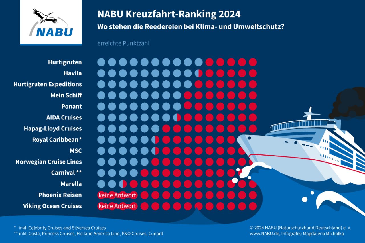 Die positiven Entwicklungen dürfen jedoch nicht über den Schaden hinwegtäuschen, den die Kreuzfahrt anrichtet: „Weiterhin leiden Klima und Umwelt unter dem Einsatz dreckiger, fossiler Kraftstoffe. Kohlenstoffdioxid und Methan heizen die Klimakrise weiter an. Schwefel, Stickoxide und Ruß belasten nicht nur die Umwelt, sondern auch die Gesundheit der Menschen”, so Daniel Rieger, NABU-Fachbereichsleiter Klima- und Umweltpolitik, „Es wird Zeit, dass die Reedereien endlich das Steuer herumreißen, und Kurs nehmen auf Klimaneutralität und Umweltfreundlichkeit.“