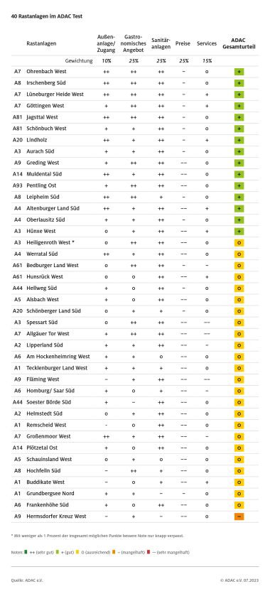 An den Rastanlagen der deutschen Autobahnen macht sich Mittelmaß breit. Beim ersten ADAC Rastanlagentest seit zehn Jahren gab es für 24 der insgesamt überprüften 40 Anlagen nur ein „ausreichend“. 15 Mal wurde die Note „gut“ vergeben und eine Anlage fiel mit „mangelhaft“ durch. Ein „sehr gut“ konnte sich keine der Rastanlagen verdienen. Waren in früheren Tests die Sanitäranlagen oftmals ein großes Ärgernis, gab es dieses Jahr in dieser Kategorie meist die besten Noten. Ärgerlich sind seit jeher die hohen Preise an den Rastanlagen und auch im diesjährigen Test fielen alle Anlagen beim Preisvergleich mit den Autohöfen durch. Weitere Kategorien waren das gastronomische Angebot, die Außenanlagen sowie ergänzende Services, zum Beispiel für Camper und die Fahrer von Elektro-Fahrzeugen.