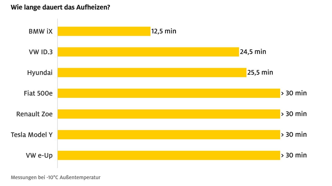 Die ADAC Ingenieure simulierten die Witterungsbedingungen einer kalten Winternacht und stellten die Fahrzeuge rund 16 Stunden bei minus 10 Grad Celsius in die Kältekammer. Danach wurde der Innenraum auf 20 Grad geheizt: VW ID.3 und Hyundai Kona Elektro benötigten dafür mehr als 20 Minuten, die restlichen Fiat 500e, Renault Zoe, Tesla Model Y und VW e-Up sogar mehr als 30 Minuten.
