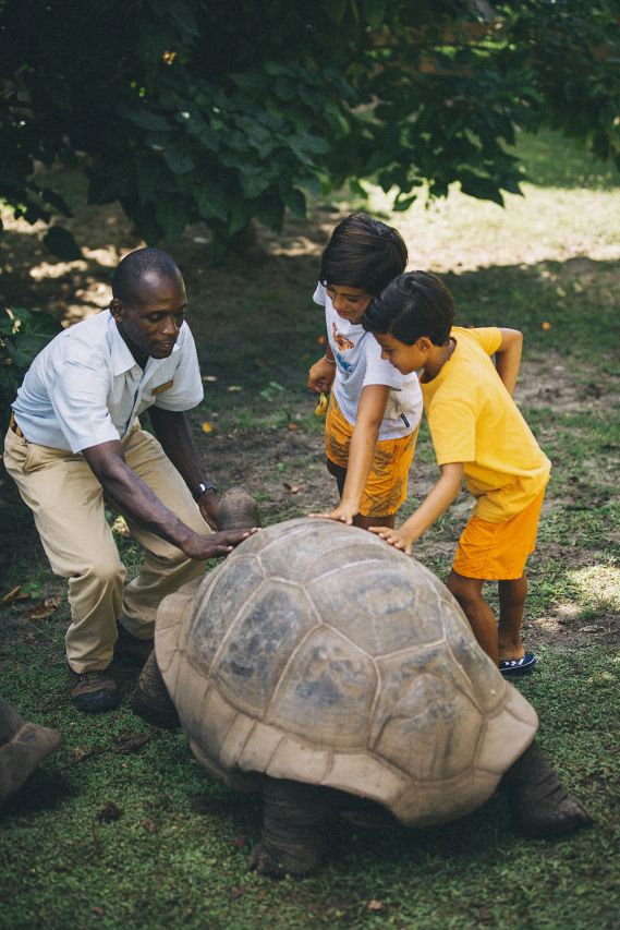 Raffles Seychelles Aldabra-Riesenschildkröte mit Kindern