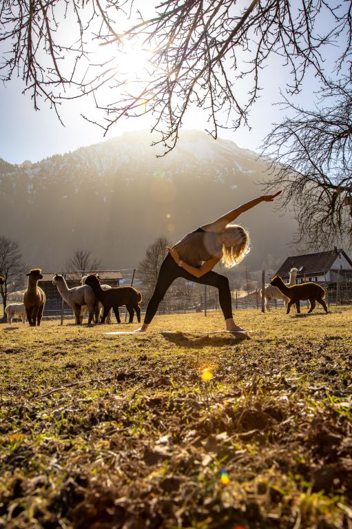 Beim Alpaka-Yoga erleben aktive Urlauber eine kleine Reise in die südamerikanischen Anden und erfahren umgeben von grasenden Paarhufern die beruhigende Wirkung von Tier und Natur im Zusammenspiel mit Yoga-Übungen. Das naturverbundene Erlebnis mit niedlicher Begleitung beginnt zunächst mit einer Gehmeditation auf der großen Alpakawiese des Hofs „Allgäu Alpaka“. Nachdem sich alle tierischen und menschlichen Teilnehmer einander bekannt gemacht haben, folgt eine 90-minütige Trainingseinheit inklusive Alpaka-Flow. Zwischen Sonnengruß, Krieger und Co. kommen Naturfreunde immer wieder in Berührung mit den neugierigen Tieren. Der beeindruckende Gipfelblick auf den Breitenberg holt die Teilnehmer wieder zurück nach Pfronten und beim gemeinsamen Teetrinken auf dem Hof lässt sich das Erlebnis ausklingen.
