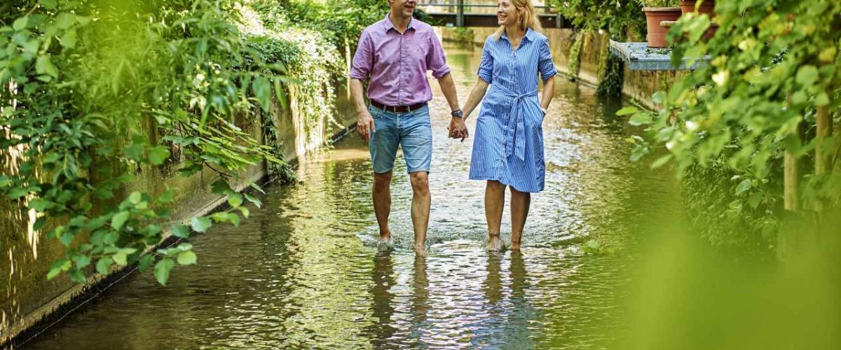 Der zweiteilige Kneipp-Rundweg in Dillingen führt Urlauber auf der Nordschleife durch die historische Altstadt, während es auf der Südschleife durch den Auwald bis hin zur Donau an die Stelle geht, an der sich Sebastian Kneipp von seiner schweren Krankheit heilte. Entlang des Themenpfads geben insgesamt 13 Infostelen Einblicke in das Leben des Pfarrers. Auch mit der Bayerisch-Schwaben-Lauschtour wandeln Interessierte mit Kopfhörern und Smartphone auf den Spuren des Wasserdoktors durch Dillingen. Dabei gibt die Kneipp-Expertin Erika Schweizer hilfreiche Tipps zur Selbstpraxis: „Bei allen Kaltanwendungen sollte die betroffene Körperregion zuvor warm sein, etwa durch das Anziehen dicker Kleidung oder durch Bewegung.“ Anschließend geht es dann im typischen Storchengang durch das erfrischende Wasser. Auch beim Kneippen am Armbecken sollten Anwender in Bewegung sein und die Unterarme einfach umeinander kreisen lassen. „Das Wichtigste dabei ist, immer auf den eigenen Körper zu hören und sobald ein unangenehmer Kältereiz spürbar ist, das Bad zu unterbrechen“, erklärt Schweizer. „Danach aber auf keinen Fall abtrocknen. Der Körper soll selbst für die Wiedererwärmung sorgen und so den Kreislauf anregen.“ Damit sind Erholungssuchende für den Selbstversuch an einer der zahlreichen Kneippanlagen der Region wie etwa im Dillinger Taxispark oder entlang des Premiumwanderwegs DonAUwald gerüstet