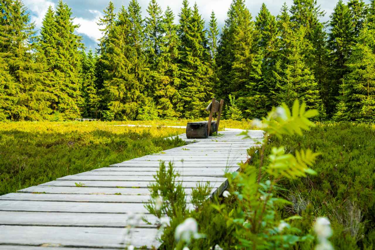 Mystisch und geheimnisvoll, aber auch karg, rau und unzugänglich sind die meisten von ihnen. Umso aufregender ist daher eine Wanderung durch das Schützenbergmoor in Oberhof, auf 890 Höhenmetern, unweit des Rennsteigs. Ein 230 Meter langer barrierefreier Holzsteg führt über das etwa fünf Hektar große Hochmoor und vermittelt spannende Informationen zu Flora und Fauna. Der Erlebnispfad ist für Besucher frei zugänglich und eignet sich ideal für einen Familien-Ausflug, denn es steht vor allem der Spaß am Forschen und Entdecken im Vordergrund. Langeweile? Keineswegs. Naturliebhaber finden hier ganz besondere Feuchtgebietspflanzen: Moos-, Rausch- und Krähenbeeren sowie den Rundblättrigen Sonnentau. Das sauerstoffarme Feuchtbiotop wächst pro Jahr nur um einen Millimeter. Das Schützenbergmoor ist ein Regenmoor, das sich hauptsächlich aus Niederschlagswasser speist.