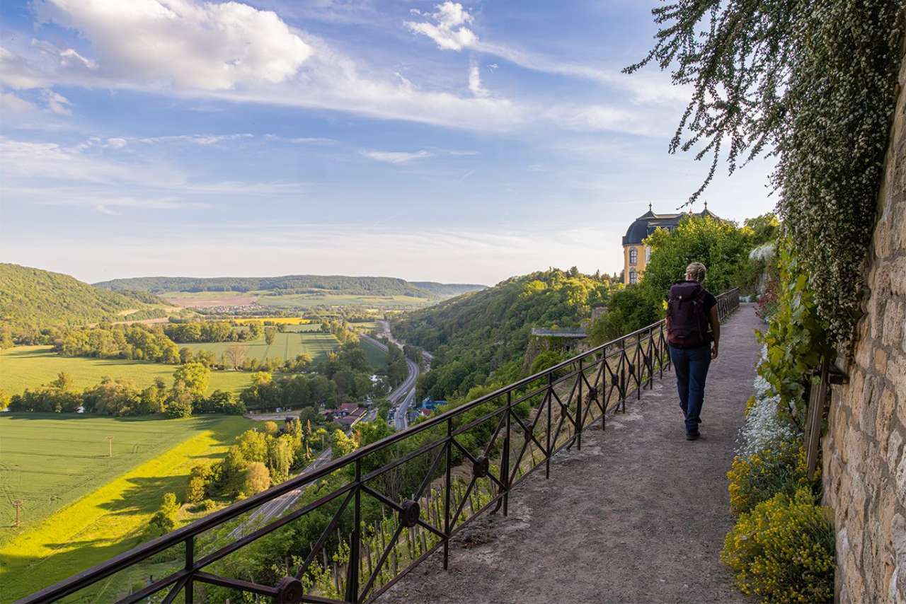 Die SaaleHorizontale trägt ihren Namen zu Recht: Sie verläuft wie ein Panoramaweg hoch über dem Saaletal und schenkt auf 91 Kilometern atemberaubende Ausblicke. Rund um Jena führt sie durch lichte Buchenwälder, über schmale Pfade an steilen Muschelkalkhängen und zu Felsvorsprüngen, von denen sich das Tal in seiner ganzen Schönheit zeigt. Entlang der Route sind die Dornburger Schlösser ein absoluter Höhepunkt: Sie leuchten wie hübsche Schmuckstücke über den Weinbergen. Auch stille Streuobstwiesen, naturbelassene Wälder und kultivierte Flächen prägen die Landschaft. Die SaaleHorizontale ist in neun Etappen gegliedert, die sich flexibel erwandern lassen. Start- und Zielpunkt ist Jena, aber dank vieler Zuwege kann man in fast jedem Ort ins Panorama einsteigen.