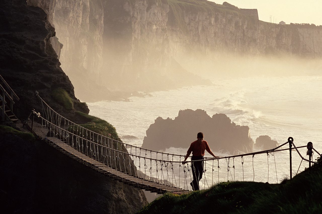 Zwischen Ballycastle und Ballintoy im County Antrim führt eine schwankende Hängebrücke zum kleinen Eiland „Carrick-a-Rede“. Sein irischer Name bedeutet soviel wie der „Fels im Weg“. Es war der Weg, den die Lachse nahmen. Seit Mitte des 16. Jahrhunderts lagen hier die bevorzugten Fanggründe in Nordirland. Die ursprüngliche Brücke wurde 1755 erbaut, um den Fischern das Stellen der Netze und die Verarbeitung des Fangs zu erleichtern. War der Lachs auf der Insel angelandet, konnte er seitdem – verarbeitet und in Kisten verpackt – direkt an Land getragen werden, ohne nochmals verschifft werden zu müssen.