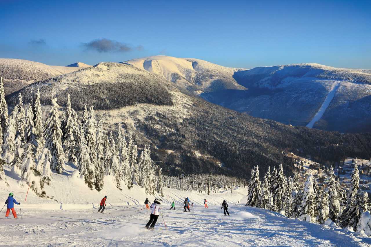 Es müssen nicht immer die Alpen sein: Wer in Tschechien Ski fährt, erlebt eine überraschende Mischung aus sportlicher Qualität und sympathischer Bodenständigkeit. Während das Riesengebirge mit dem Skigebiet Špindlerův Mlýn mit 27 Kilometern Skipisten, sechs Sesselliften und mehr als 90 Kilometern Langlaufloipen sportliche Herausforderungen bietet, lockt Klínovec (dt. Keilberg) im Erzgebirge nicht nur mit weiten Loipen und idyllischen Winterlandschaften, sondern auch mit den längsten Skipisten in Tschechien (Rondo mit 5.2 Kilometern und Lázeňská mit 3,4 Kilometern). Im Süden wiederum begeistert der grenznahe Böhmerwald (Tschechisch: Šumava) mit der Wintersportdestination Lipno nad Vltavou und ihren gut präparierten Pisten, weiten Ausblicken und gemütlichen Chalets – ideal für Genießer und Familien. Dort, am zugefrorenen Moldaustausee Lipno, findet man außerdem die längste Eislaufbahn der Welt (11 Kilometer), eine Skicross-Strecke, einen Snowpark und den ersten Baumwipfelpfad Tschechiens, der 364 Tage im Jahr geöffnet bleibt. Und wer es gemütlicher angehen möchte, schlendert im Bäderdreieck durch verschneite Kurorte wie Karlsbad und Marienbad und taut dort in traditionsreichen Spas auf.